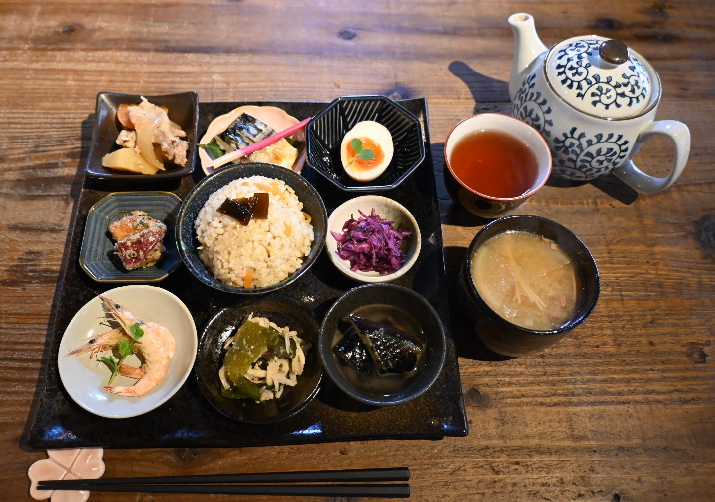 店主のこだわりが詰まった朝ごはんのメニューは、「しあわせ10品朝御膳」(1,800円)。